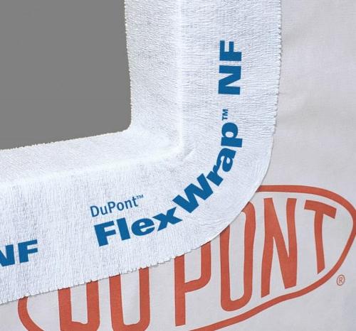 Dupont flex wrap Nf is a premium performance, extendable self-adhered flashing material that can be applied over a wide range of building substrates, including non-nail able sheathing materials like PS foam board, Fiberboard, concrete masonry unit (cmu), and other such materials. Dupont flex wrap Nf does not require the use of mechanical fasteners in the flexed corner areas when installed according to the flashing installation guidelines issued by DuPont.
