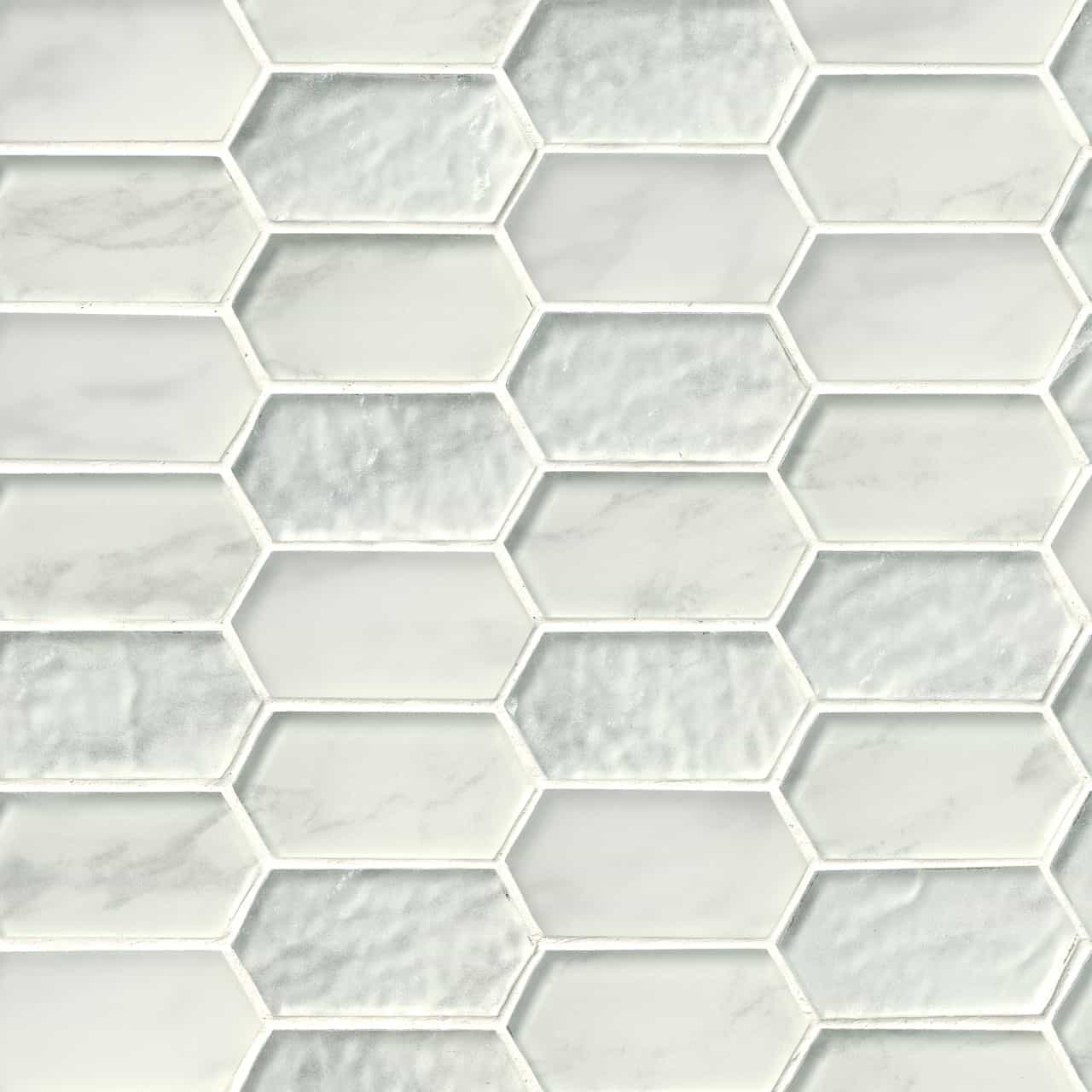 Calypso Picket Pattern Glass Mosaic Tiles feature a soft white background with tonal inflections from the crystallized glass. The design, reminiscent of the peaks of a picket fence have a contemporary and modern flair, and will coordinate beautifully with a variety of natural stone products and slabs in MSI's inventory. Suitable for countertops, accent walls, and other features.