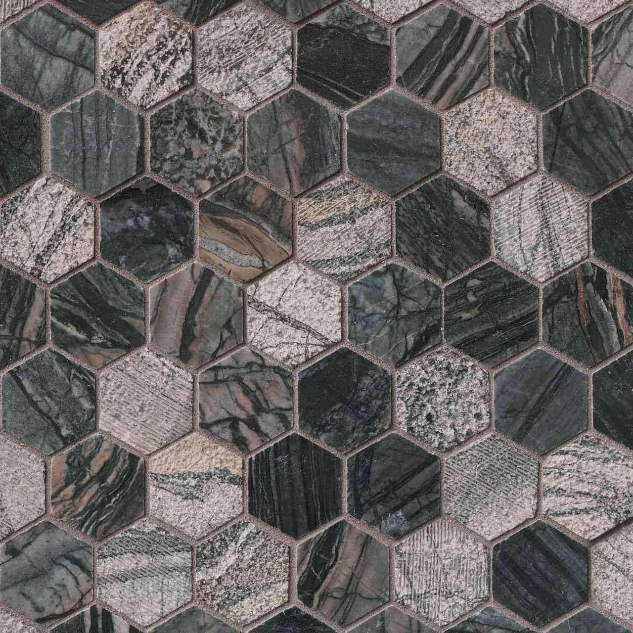 Dramatic and daring, Henley Hexagon Marble Mosaic Tile features rich black natural marble with dramatic beige, gray and weight veins. To complement the artistic nature of this tile, multiple finishes were used to add extra dimension and interest. Mesh-backed for easy installation, this tile is suitable for a variety of projects including as an accent wall, shower, and kitchen backsplash installation.