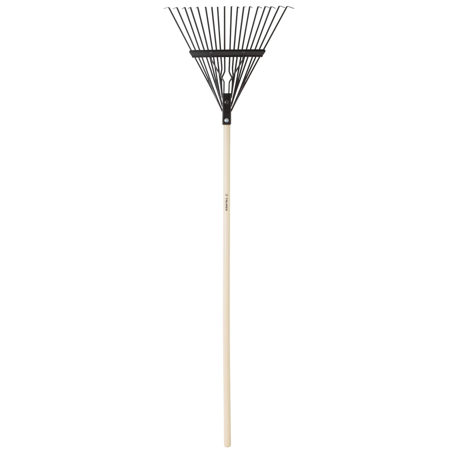 The Truper 18-Tine steel leaf rake is used for clearing leaves and debris from lawns and paved surfaces such as driveways and sidewalks. This rake can also be used for pulling out thatch for a healthier lawn, the steel head is bolted to the handle with a strong coil spring for a secure connection and smooth raking action.